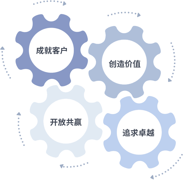 成就客户是一切决策的出发点,,,创造价值是衡量所有工作的标准,,,,追求卓越是我们做事做人的态度,,,,开放共赢是我们的格局也是最终的结果。。。价值观的齿轮环环相扣,,,,推动着组织里的每个人不断向前。。。