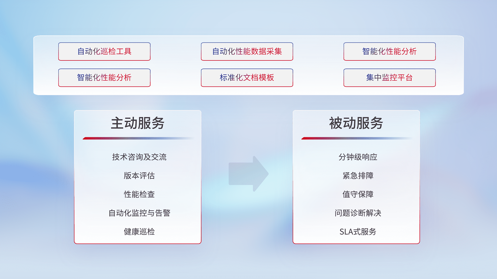 智能化工具和标准化文档,,,,保障服务质量,,,提供主动服务(包含技术咨询、、、、版本评估、、、性能检查、、、、自动化监控与告警、、、、健康巡检)和被动服务包含(分钟级响应、、紧急排障、、、值守保障、、、、问题诊断解决、、SLA服务)。。。。